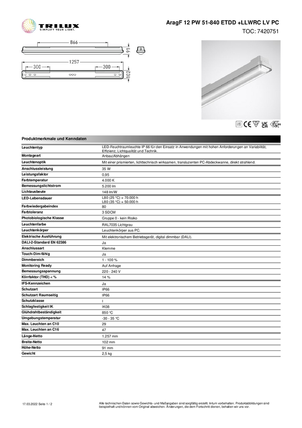 Lampa LED do wilgotnych pomieszczeń Trilux AragF 12 P #7420751 7420751, 35 W, 5200 lm