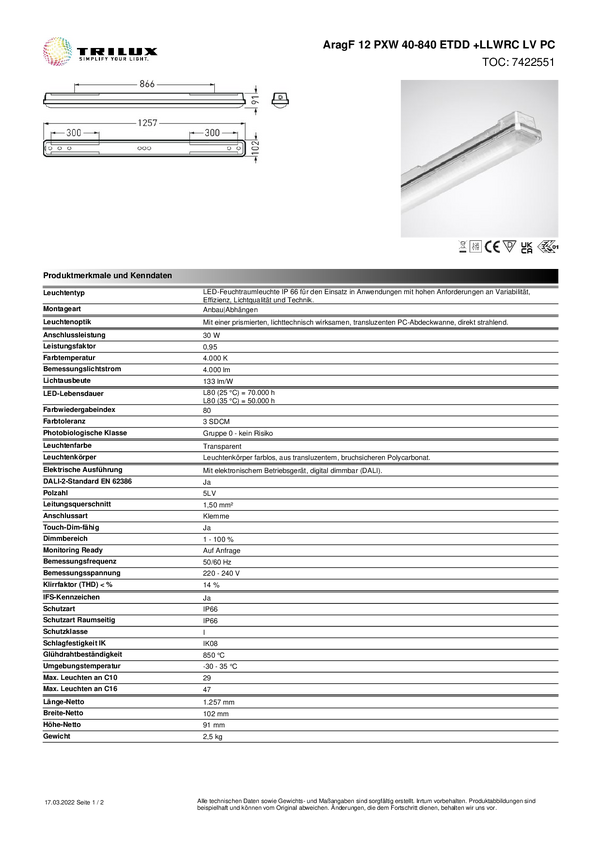 Lampa LED do wilgotnych pomieszczeń Trilux AragF 12 P #7424351 7424351, 40 W, 5000 lm