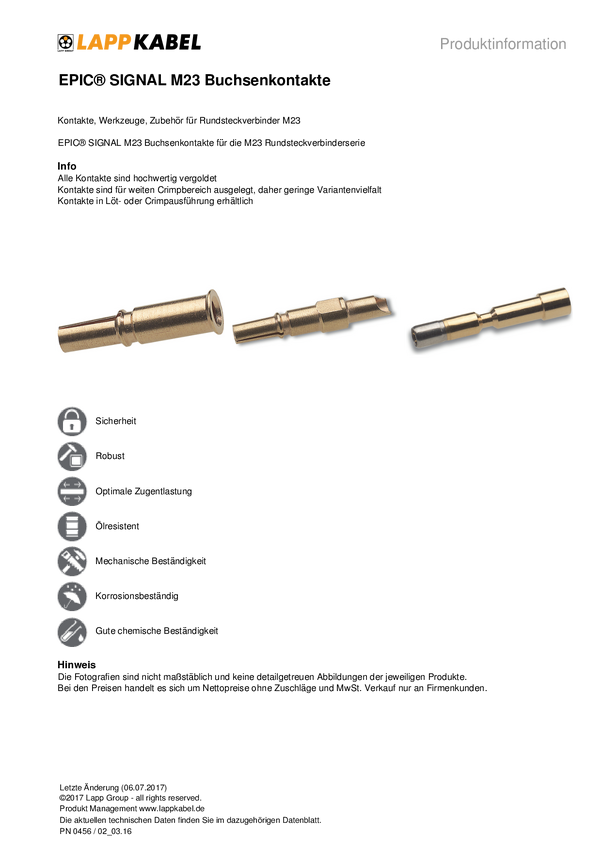 Styk gniazda EPIC® SIGNAL M23 1 mm Lapp Zubehör LAPP 74200600 Zawartość: 100 szt.
