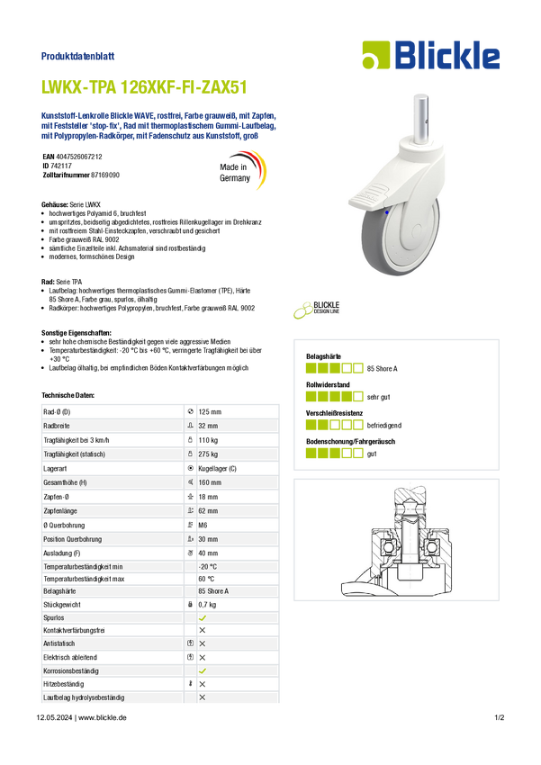 Blickle 742116 LWKX-TPA 126XKF-ZAX51 Rolka skrętna z tworzywa sztucznego Średnica koła: 125 mm Maksymalne obciążenie: 11