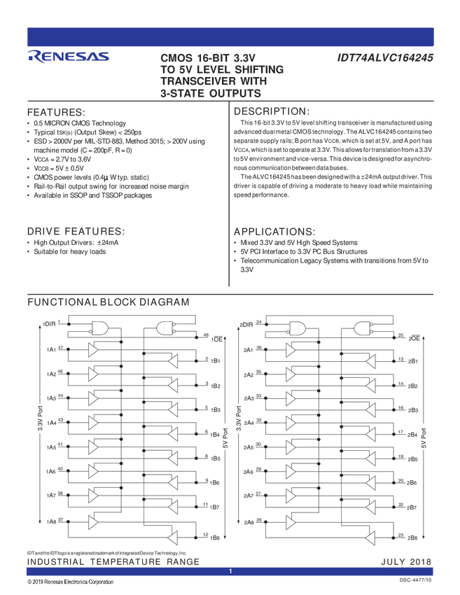 3.3V CMOS 16-Bit 3.3V to 5.0V Level Shifting Transceiver with 3-State Outputs