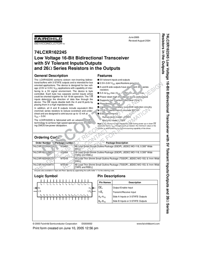 Low Voltage 16-Bit Bidirectional Transceiver with 5V Tolerant Inputs/Outputs and 26 Ohm Series Resistors in the Outputs