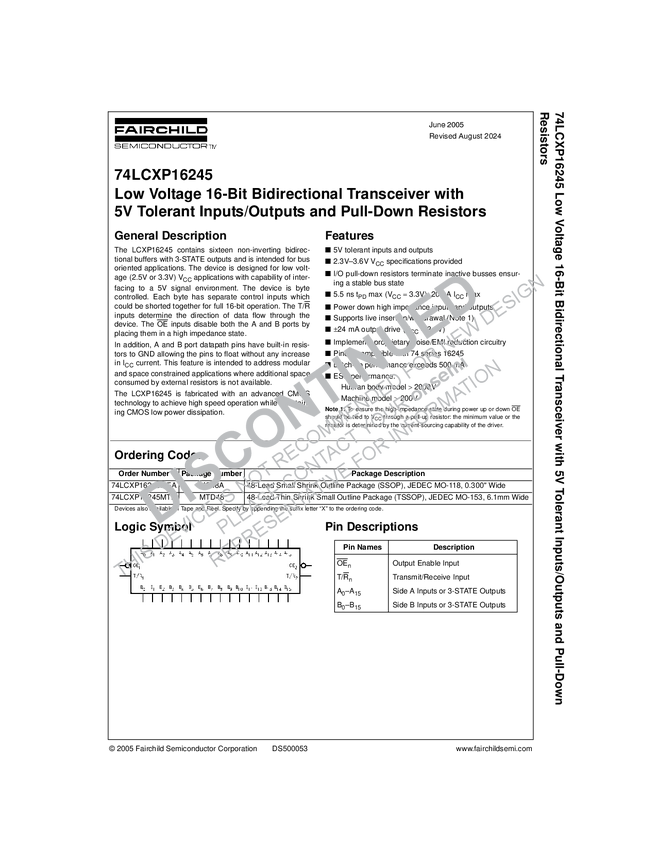 Low Voltage 16-Bit Bidirectional Transceiver with 5V Tolerant Inputs/Outputs and Pull-Down Resistors