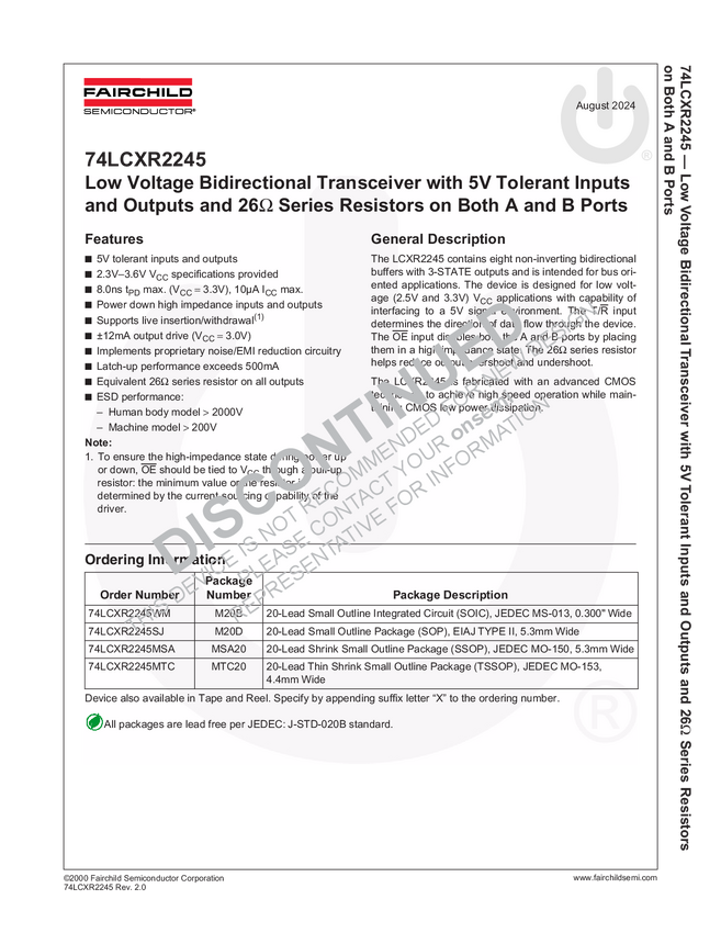 Low Voltage Bidirectional Transceiver with 5V Tolerant Inputs and Outputs and 26 Ohm Series Resistors on Both A and B Ports