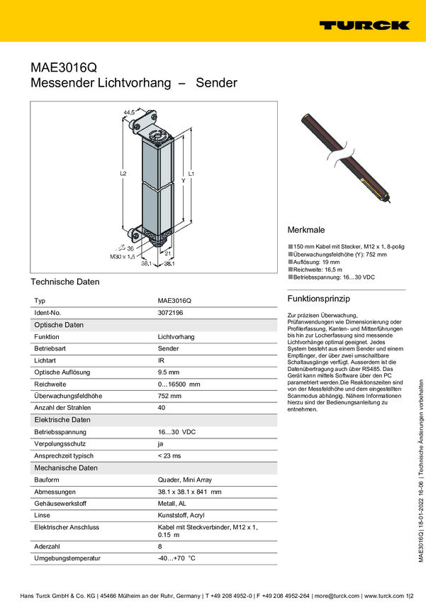 Turck Kurtyna świetlna MAE3016Q Wysokość ochronna 752 mm