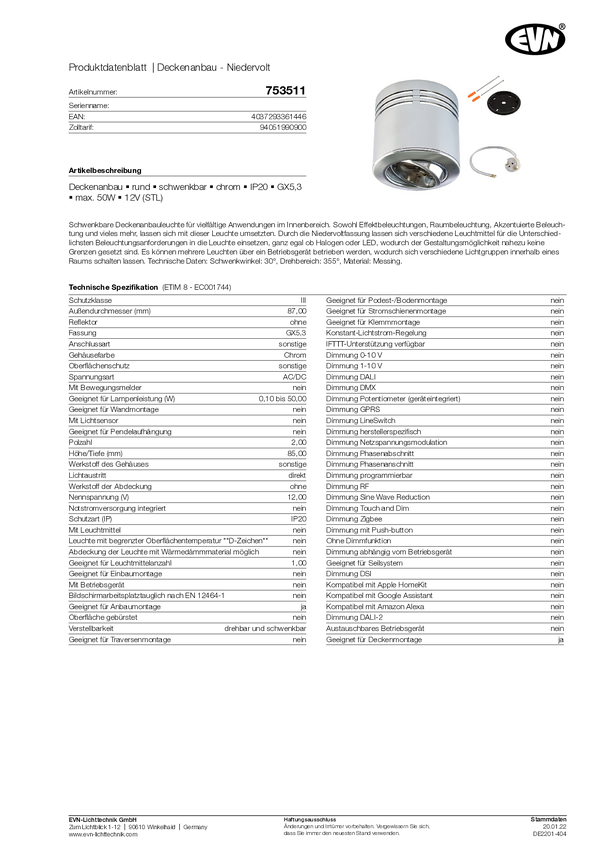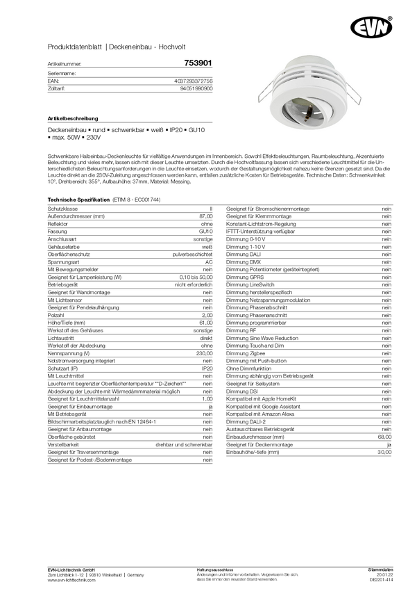 Pierścień montażowy do oświetlenia EVN 753901 753901 50 W