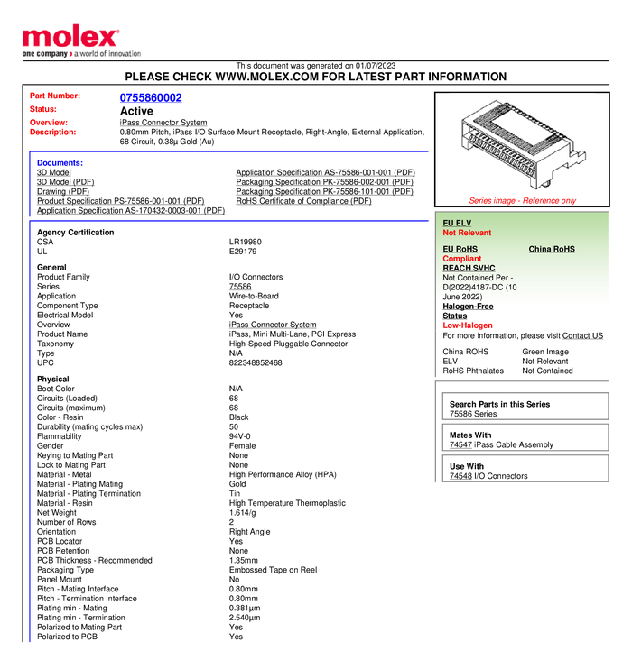 Molex 755860002 Listwa kołkowa, żeńska, do wbudowania, standardowa, piny: 68, 1 szt.