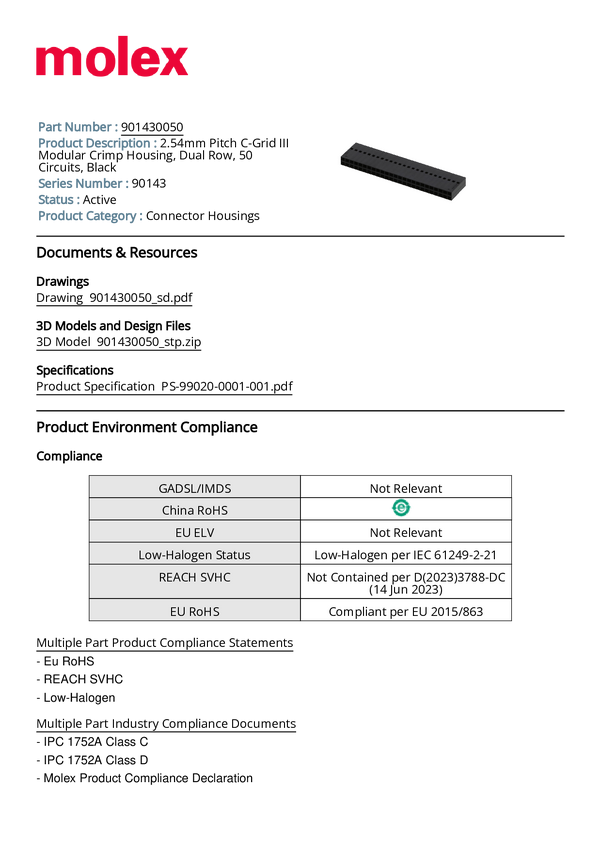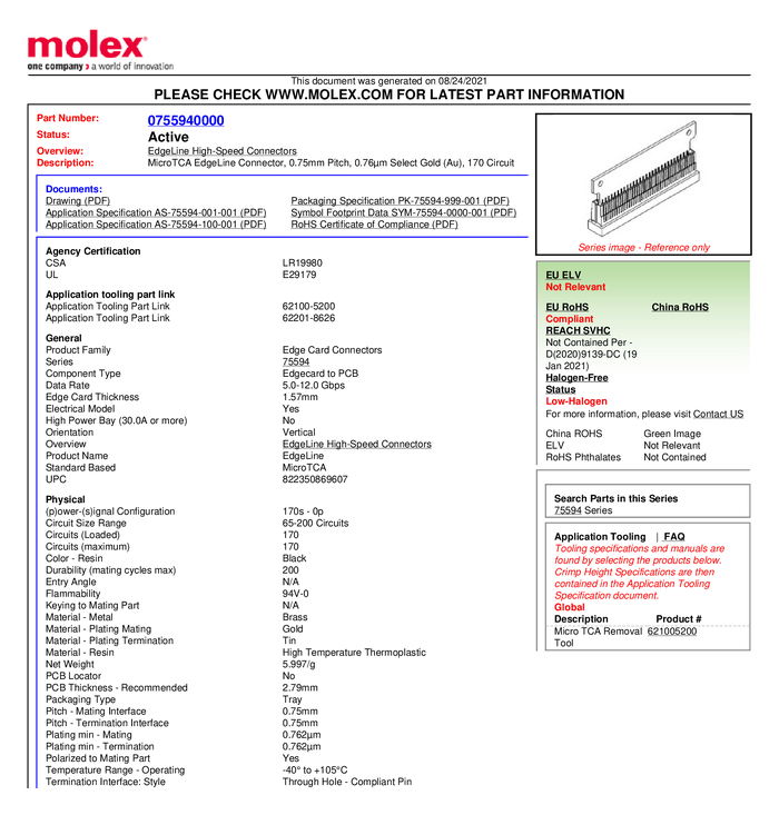 Molex Listwa kołkowa, żeńska, do wbudowania, standardowa Ilość pinów 170 Wymiary siatki: 0.75 mm 755940000 1 szt. paleta
