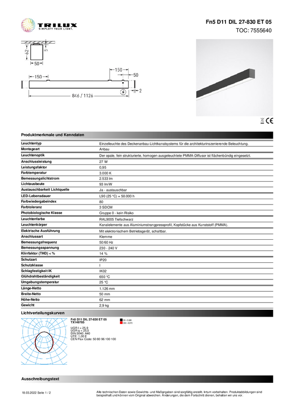 Lampa sufitowa LED Trilux Fn5D11DIL27-830ET05 7555640 27 W 2533 lm czarny