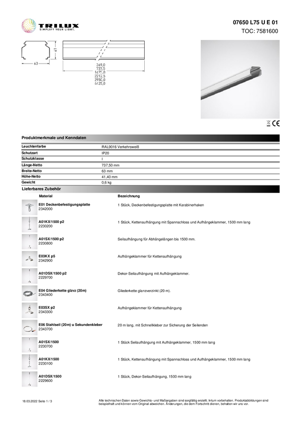 Szyna montażowa Trilux 07650 L75 U E 01 7581600, 1 szt.
