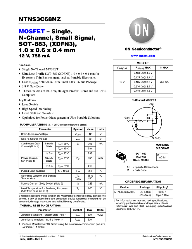 Single N−Channel Small Signal MOSFET 12V, 758mA, 160mΩ
