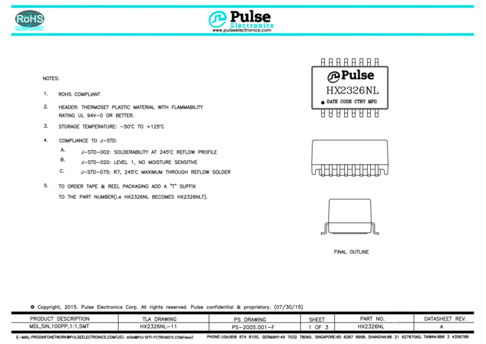 Telecom Transformer 1:1 1500Vrms 0.75Ohm Prim. DCR 0.75Ohm Sec. DCR -1.2dB Surface Mount