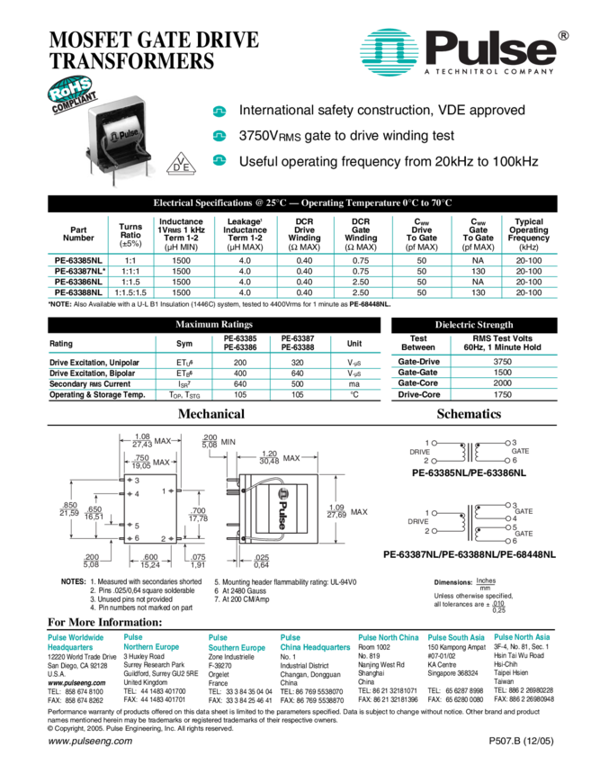 Pulse Transformer 1:1 3750Vrms 0.4Ohm Prim. DCR 0.75Ohm Sec. DCR 50pF Through Hole