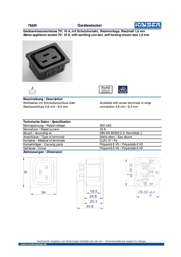 Martin Kaiser 766/10/63/sw/C Złącze męskie IEC 766 złącze żeńskie do wbudowania pionowego Łączna ilość styków: 2 + PE 16
