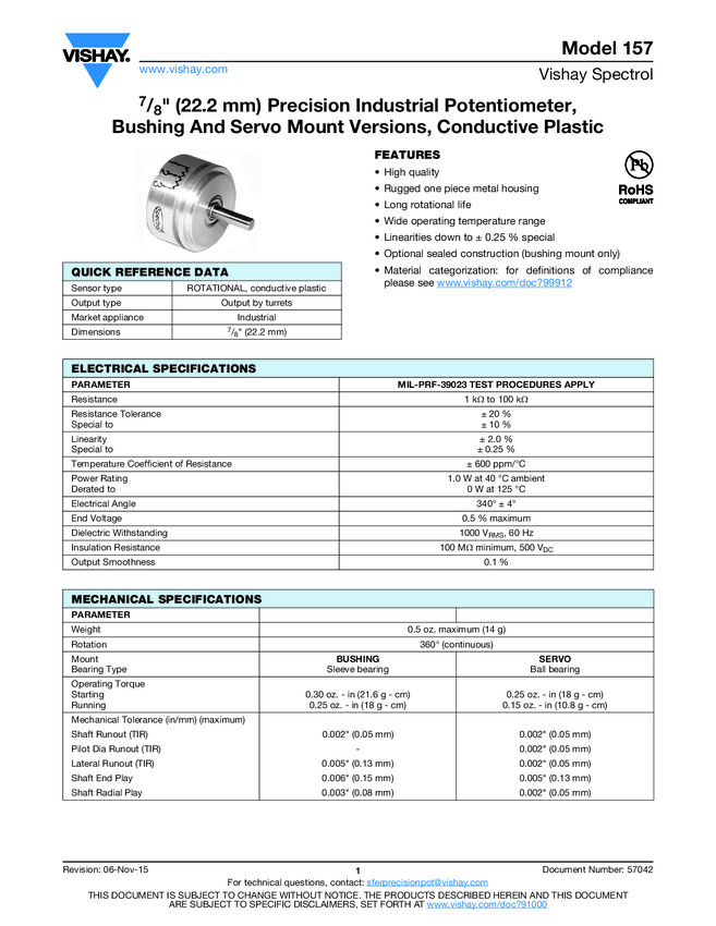 Potencjometr precyzyjny - przewodzący plastyk - Bushing; 1 obrotowy; średnica 7/8"=22,23mm gł.8.76mm + 3,2mm piny; ośka 1/4"=6,35mm dł.22,2mm; moc 1W; trwwałość 2 m cykli;Lin. 2%; moc 1W; kąt 340 st.bez stopu nowe oznaczenie PM157-B-1K stare oznaczenie 157-11-102 ; stare nasze oznaczenie PM157-11-102
