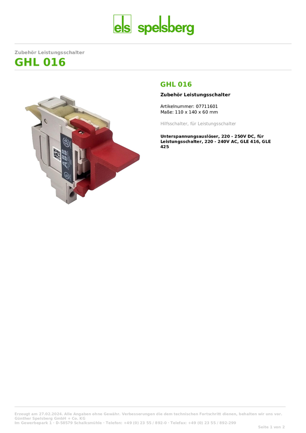 Przełącznik pomocniczy Spelsberg GHL 016 1 szt.
