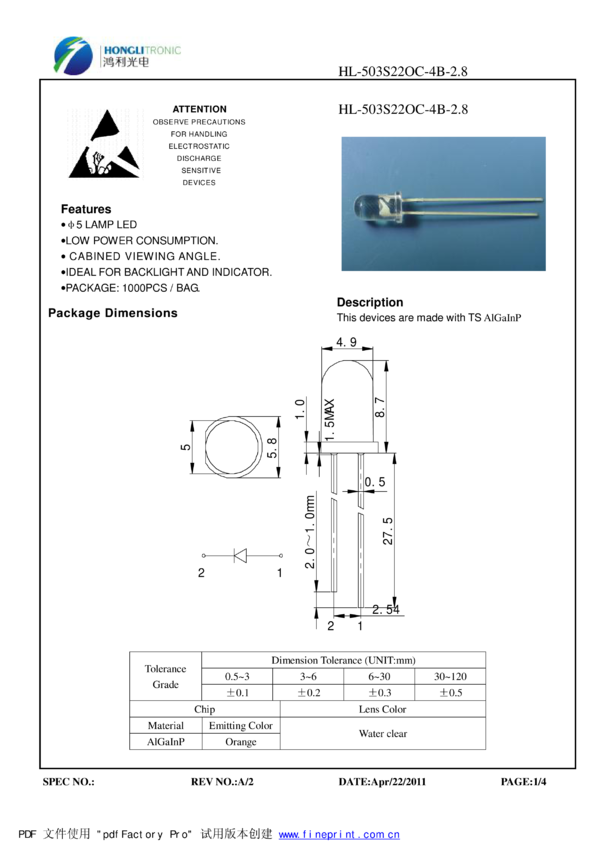 Dioda LED, , 600-610 nm, 780-1715 mCd, water clear, 60 stopni, Honglitronic
