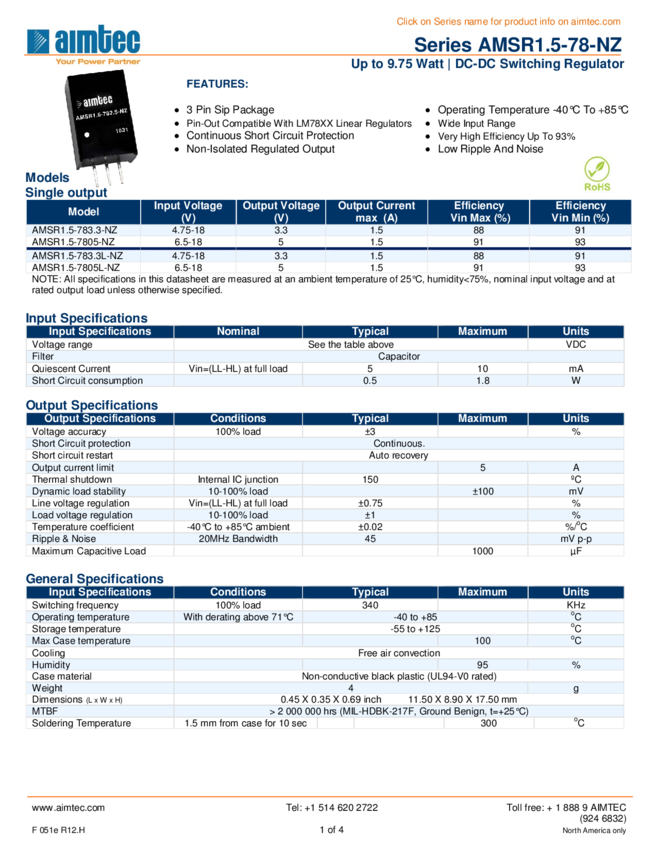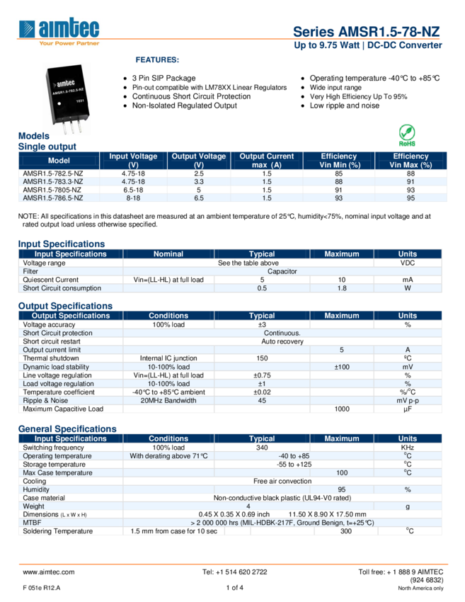 Module DC-DC Single-OUT 3.3V 1.5A 9.75W 3-Pin SIP Tube