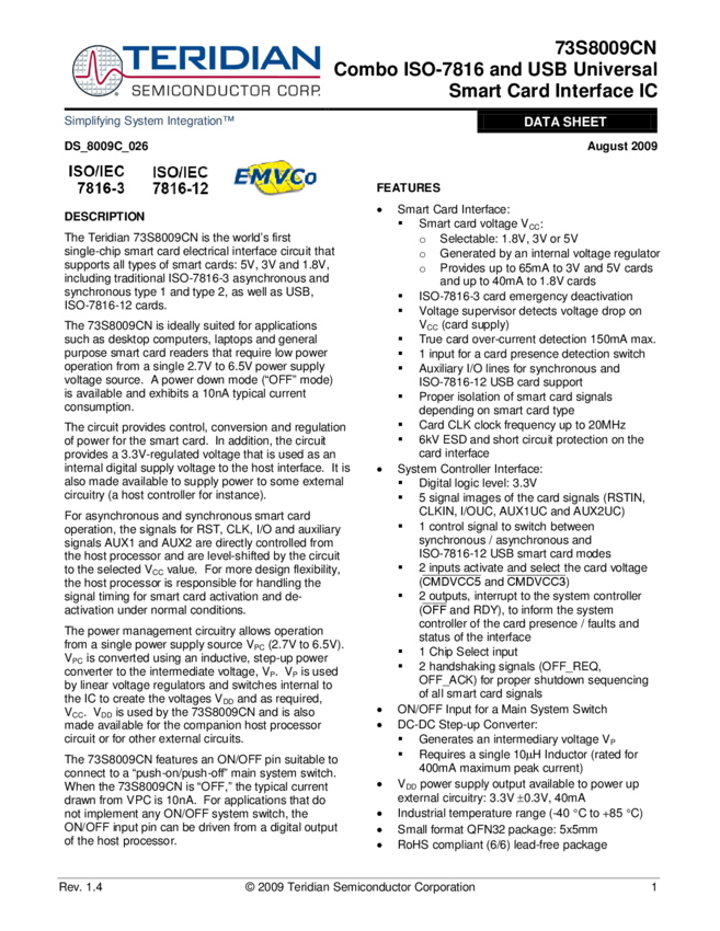 73S8009CN Combo ISO 7816 and USB Universal Smart Card Interface IC