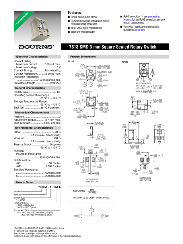 Switch Rotary SPDT 2 Flush Screwdriver J-Bend 0.1A 16VAC 16VDC Embossed T/R