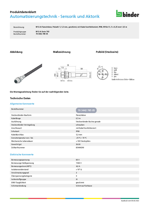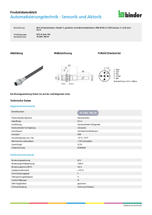 binder 70 3441 785 05-20 Złącze niekonfekcjonowane czujnika/aktuatora złącze męskie z kołnierzem 0.5 m Ilość pinów: 5 1