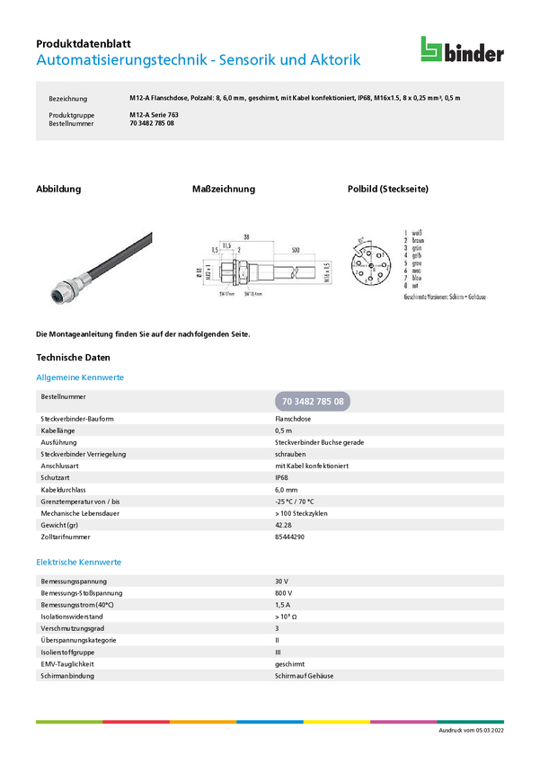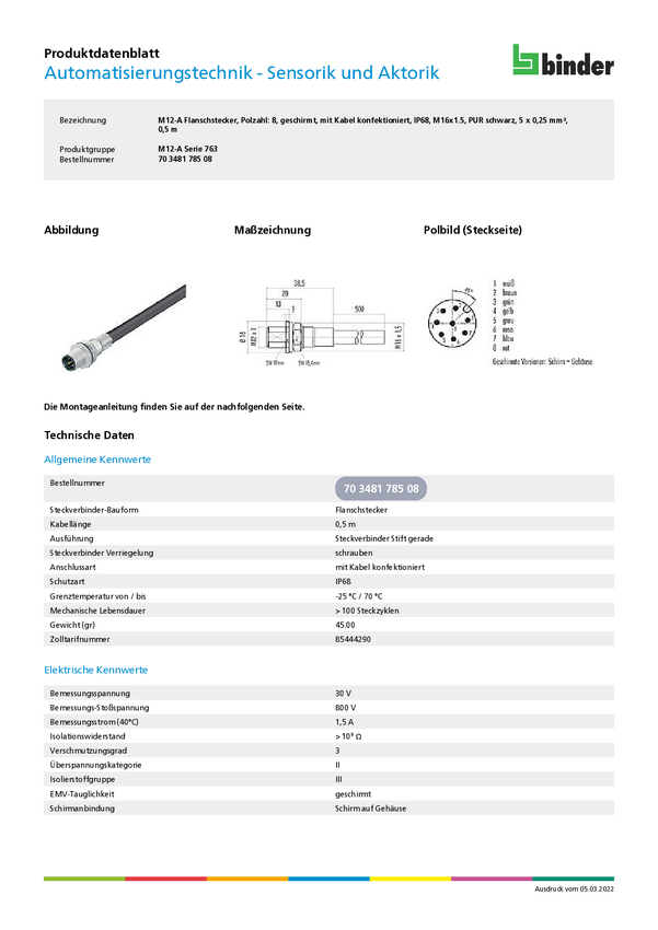 binder 70 3481 785 08-20 Złącze niekonfekcjonowane czujnika/aktuatora złącze męskie z kołnierzem 0.5 m Ilość pinów: 8 1