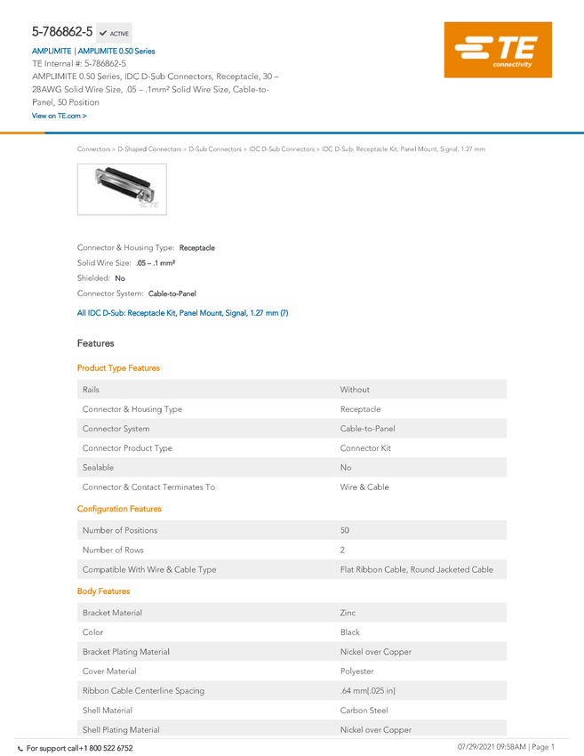 TE Connectivity 6-786862-5 TE AMP AMPLIMITE .050 Series Panel Mount Connector, 1 szt.