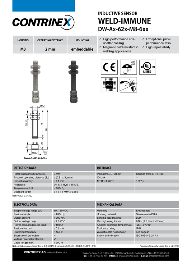 Contrinex Czujnik indukcyjny M8 podtynkowy PNP DW-AS-623-M8-697