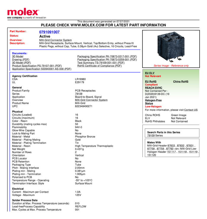 Molex 791091007 Listwa kołkowa, żeńska, do wbudowania, standardowa, piny: 16, 1 A, 1 szt.