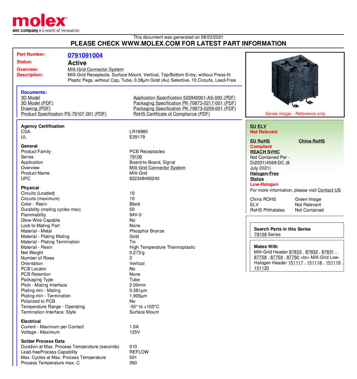 Molex 791077006 Obudowa złącza pin żeńskiego na PCB, 1 szt.
