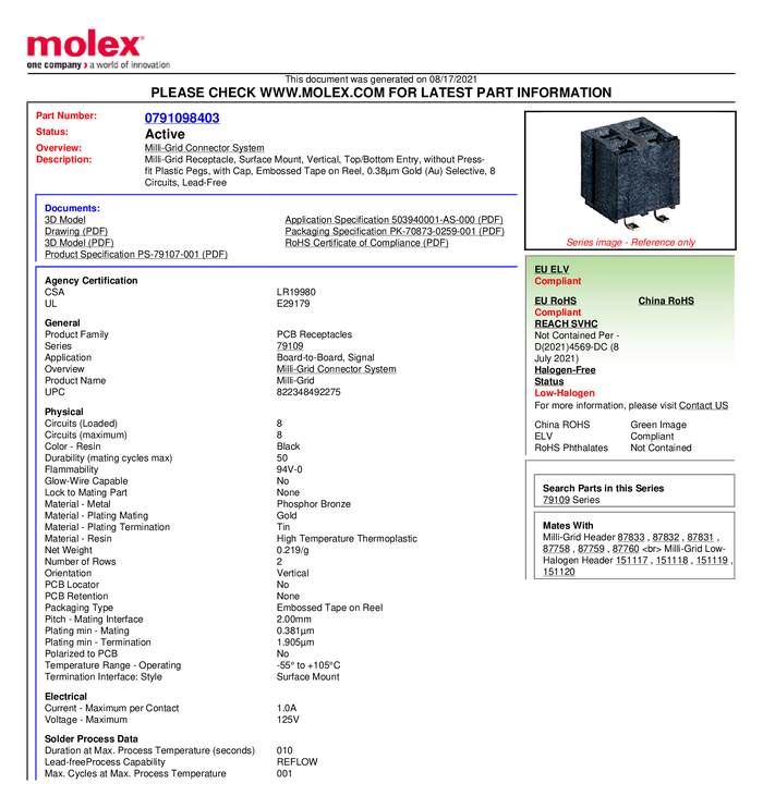 Molex 791098403 Listwa kołkowa, żeńska, do wbudowania, standardowa, piny: 8, 1 A, 1 szt.