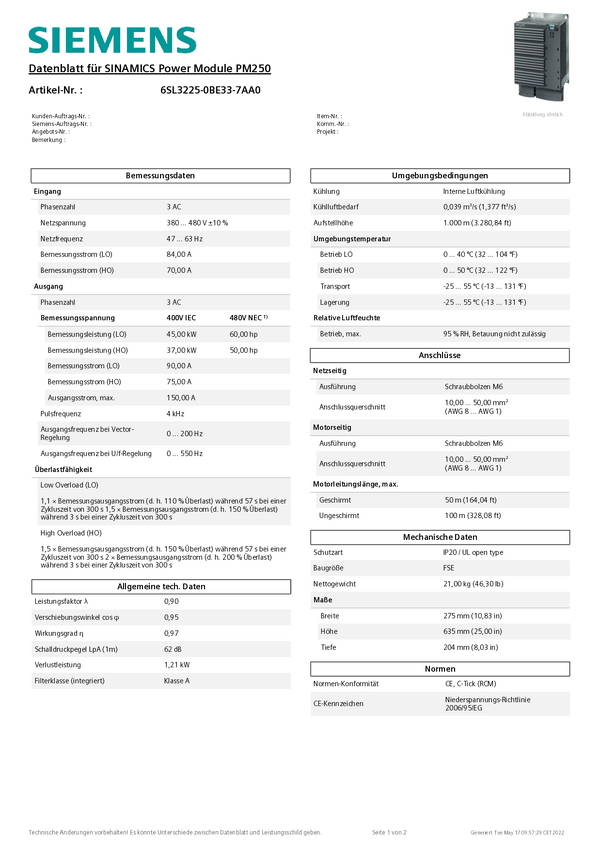 Przemiennik częstotliwości Siemens 6SL3225-0BE33-7AA0 37.0 kW 380 V, 480 V