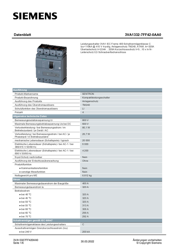 Wyłącznik zasilania Siemens 3VA1332-7FF42-0AA0 Zakres ustawienia (Prąd): 224 - 320 A Maksymalne napięcie przełączania: 6