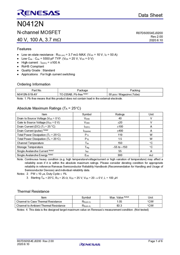 Nch Power MOSFET 40V 100A 3.7mohm TO-220