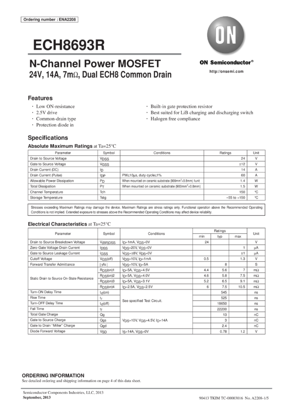 N-Channel Power MOSFET 24V, 14A, 7mOhm, Dual ECH8 Common Drain