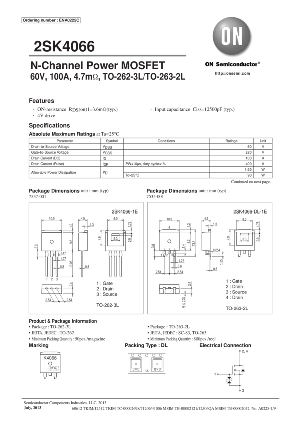 N-Channel Power MOSFET, 60V, 100A, 4.7mOhm, TO-262-3L/TO-263-2L
