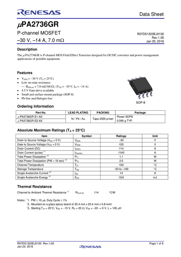Nch Power MOSFET 30V 16A 7mohm SOP-8 / SOIC-8