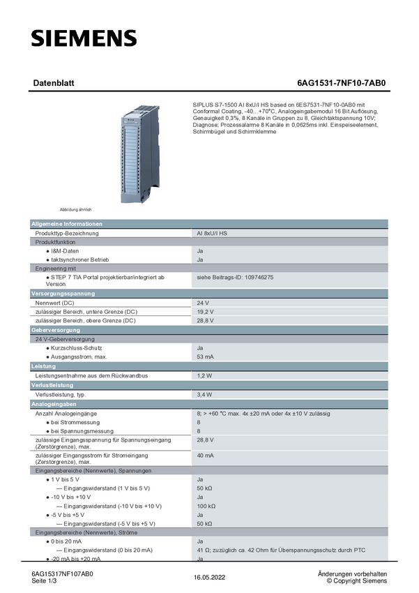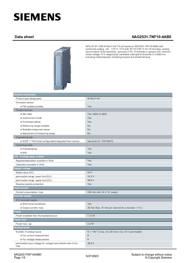Moduł wejściowy analogowy PLC Siemens 6ES7531-7NF00-0AB0 6ES75317NF000AB0