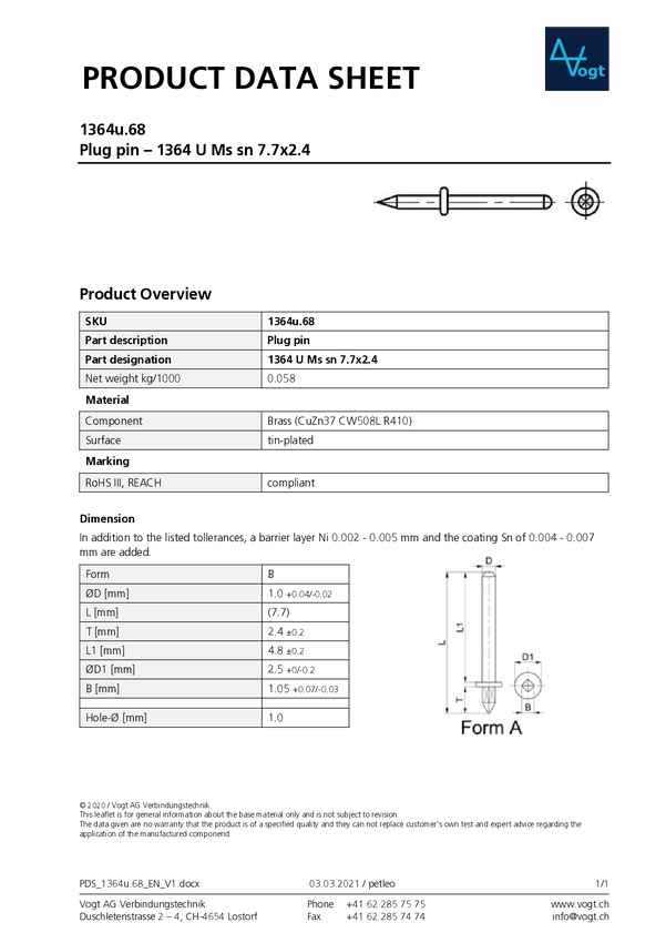 Vogt Verbindungstechnik 1364 U Ms sn 7.7x2.4 Złączka męska Powierzchnia styku ocynowany 1000 szt. (D x S) 7.7 mm x 2 mm