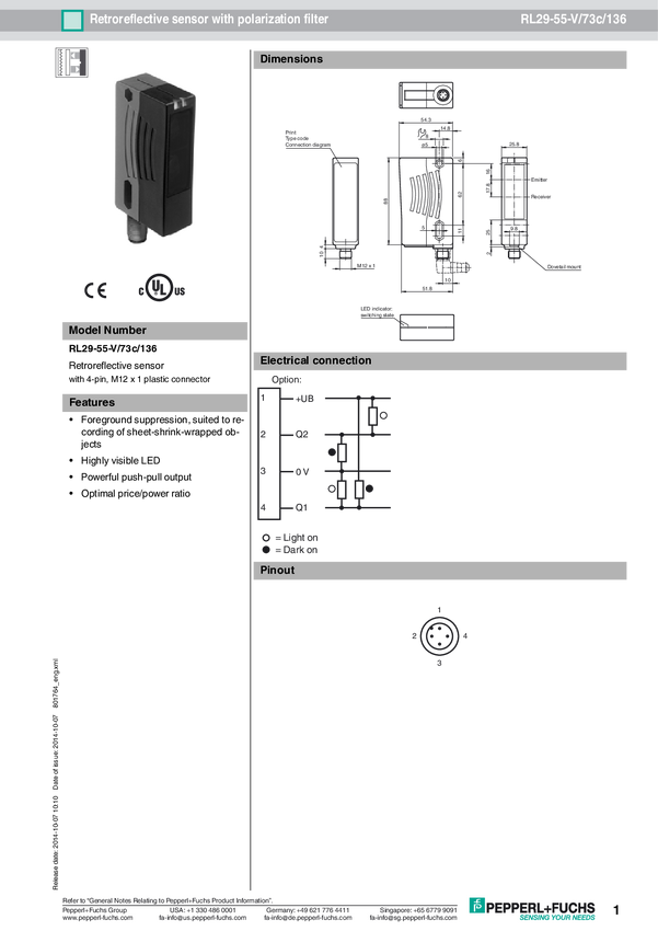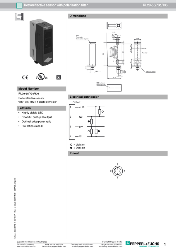 Czujnik fotoelektryczny Pepperl+Fuchs RL29-55/25/73c/136 801763 1 szt.