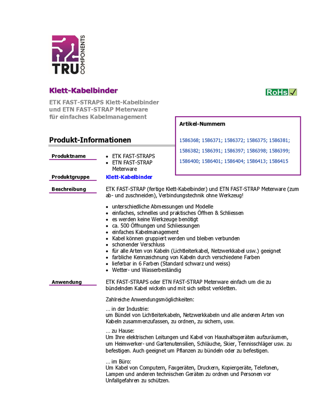 Opaska kablowa na rzepy TRU COMPONENTS 803-330-Bag 1586400, (D x S) 300 mm x 16 mm, 10 szt.
