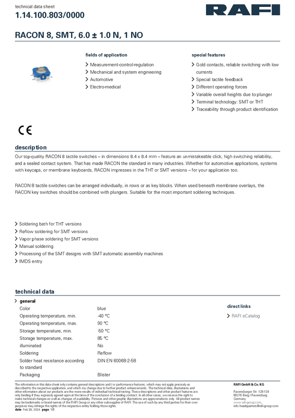 RAFI 1.14.100.803/0000 1.14.100.803/0000 Przycisk 35 V 0.1 A chwilowy (D x S) 8.4 mm x 8.4 mm 1 szt.