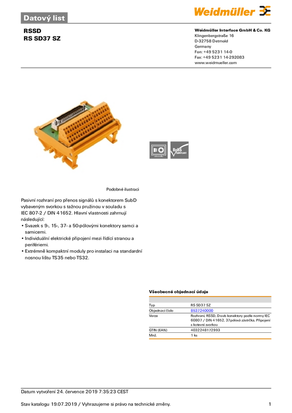 Interfejs, RSSD, Wtyki SUB-D wg IEC 807-2 / DIN 41652, Gniazdo 37 bieg, złącze sprężynowe RS SD37 BZ Weidmüller Zawartoś