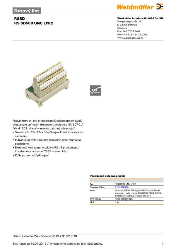 Interfejs, RSSD, Wtyki SUB-D wg IEC 807-2 / DIN 41652, Gniazdo 50 bieg, złącze sprężynowe RS SD50 SZ Weidmüller Zawartoś