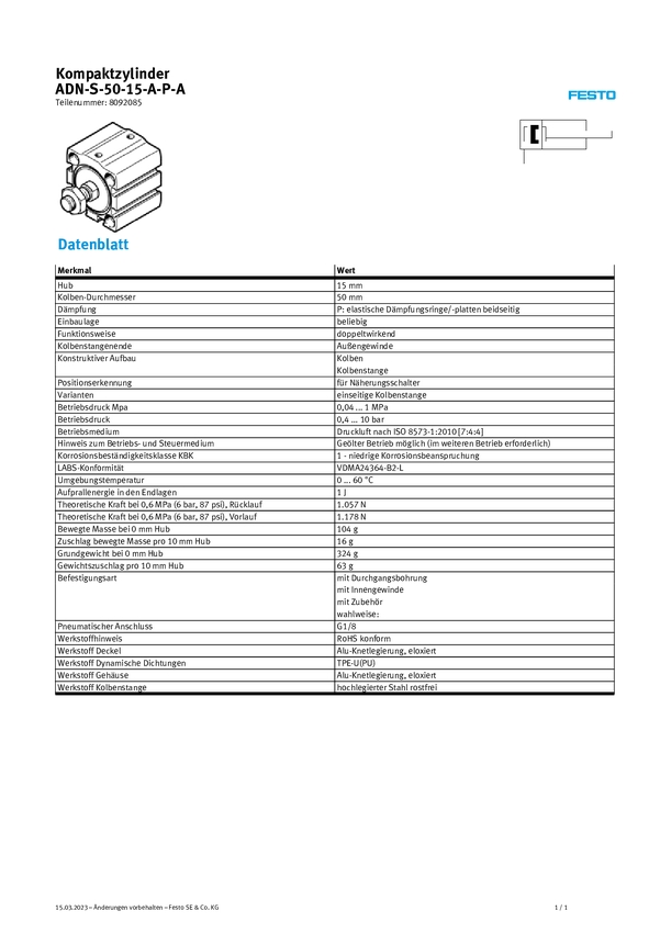 Siłownik kompaktowy FESTO ADN-S-50-15-A-P-A 8092085, Długość skoku: 15 mm