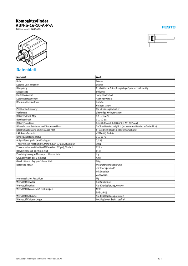 Siłownik kompaktowy FESTO ADN-S-16-10-A-P-A 8091678, Długość skoku: 10 mm