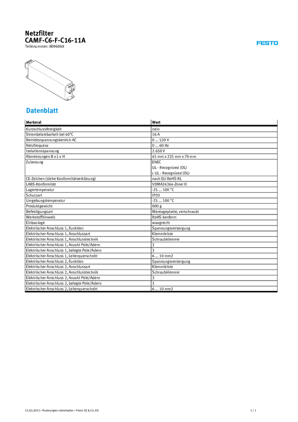 FESTO 8096894 CAMF-C6-F-C42-11A Filtr sieciowy (D x S x W) 295 x 50 x 85 mm 1 szt.