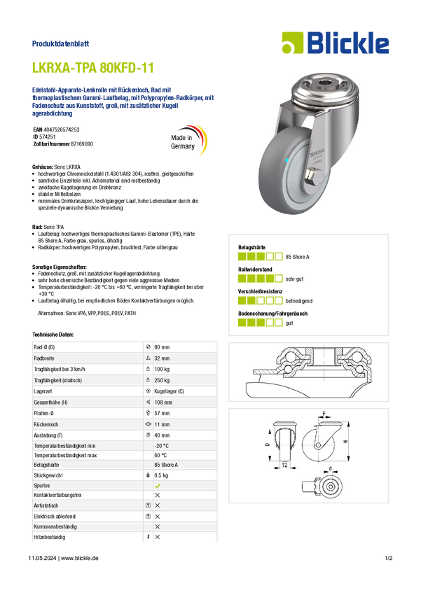Kółko Blickle LKRXA-TPA 80KD-11-FK, obrotowe, średnica: 80 mm