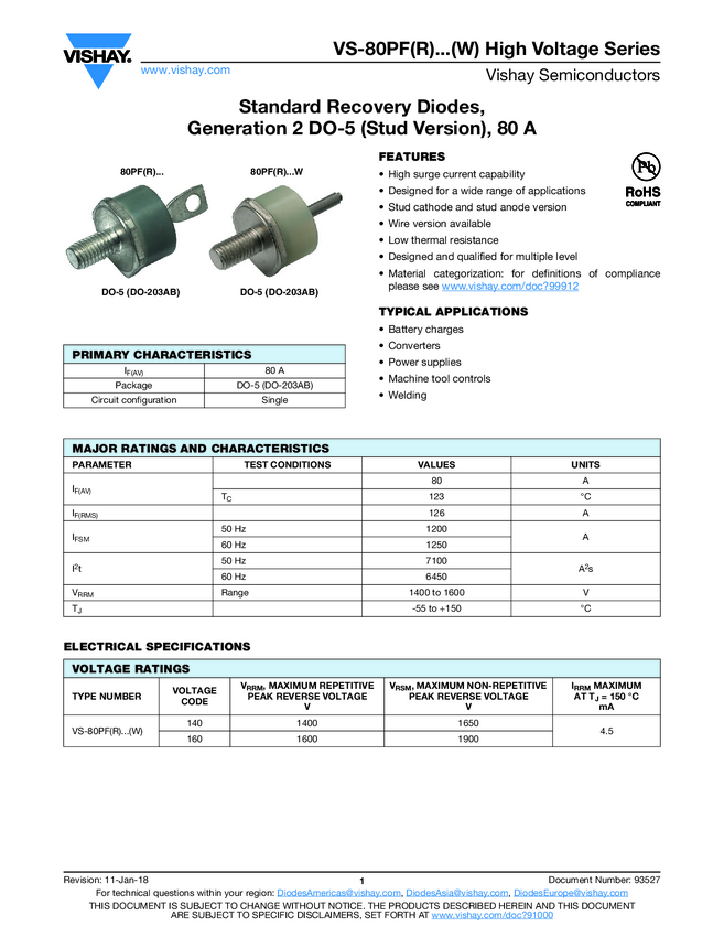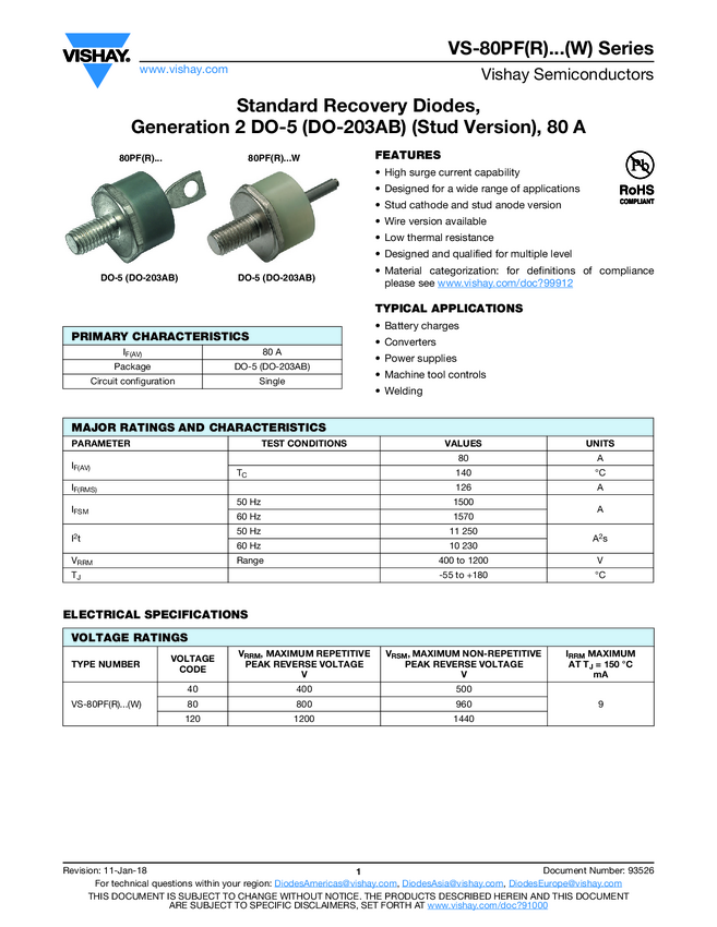 Standard Recovery Diodes, Generation 2 DO-5 (DO-203AB) (Stud Version), 80 A
