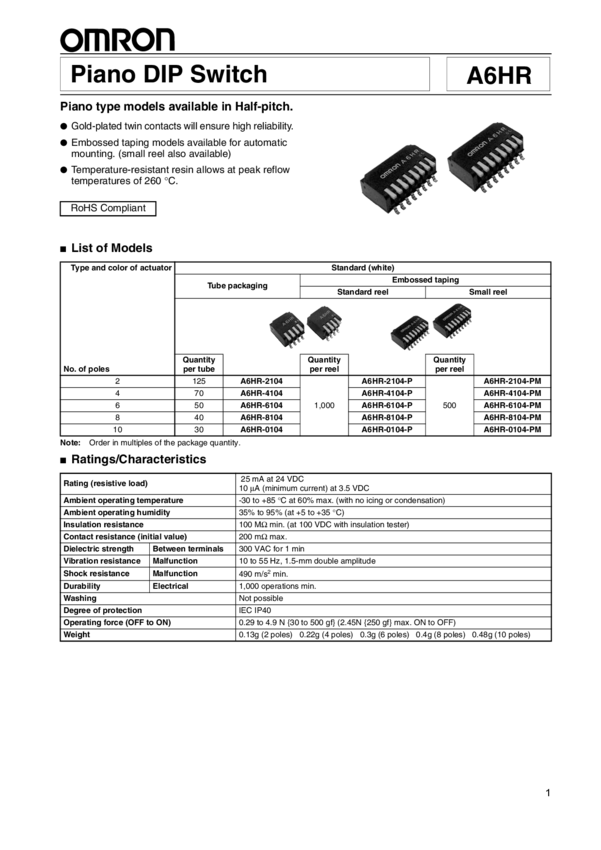 Switch DIP OFF ON SPST 8 Piano 0.025A 24VDC Gull Wing 1.27mm SMD Embossed T/R